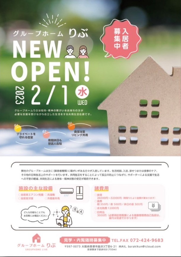 グループホームりぶは、大阪泉州貝塚で閑静な住宅環境の下、知的障害、精神障害、強度行動障害をお持ちの方向けのグループホームを開いております。ご家族様のご負担を少しでも軽減できるよう、スタッフ一同利用者様をあたたかい雰囲気でお迎えいたします。ご不明な点等ございましたらお気軽にお問い合わせください。